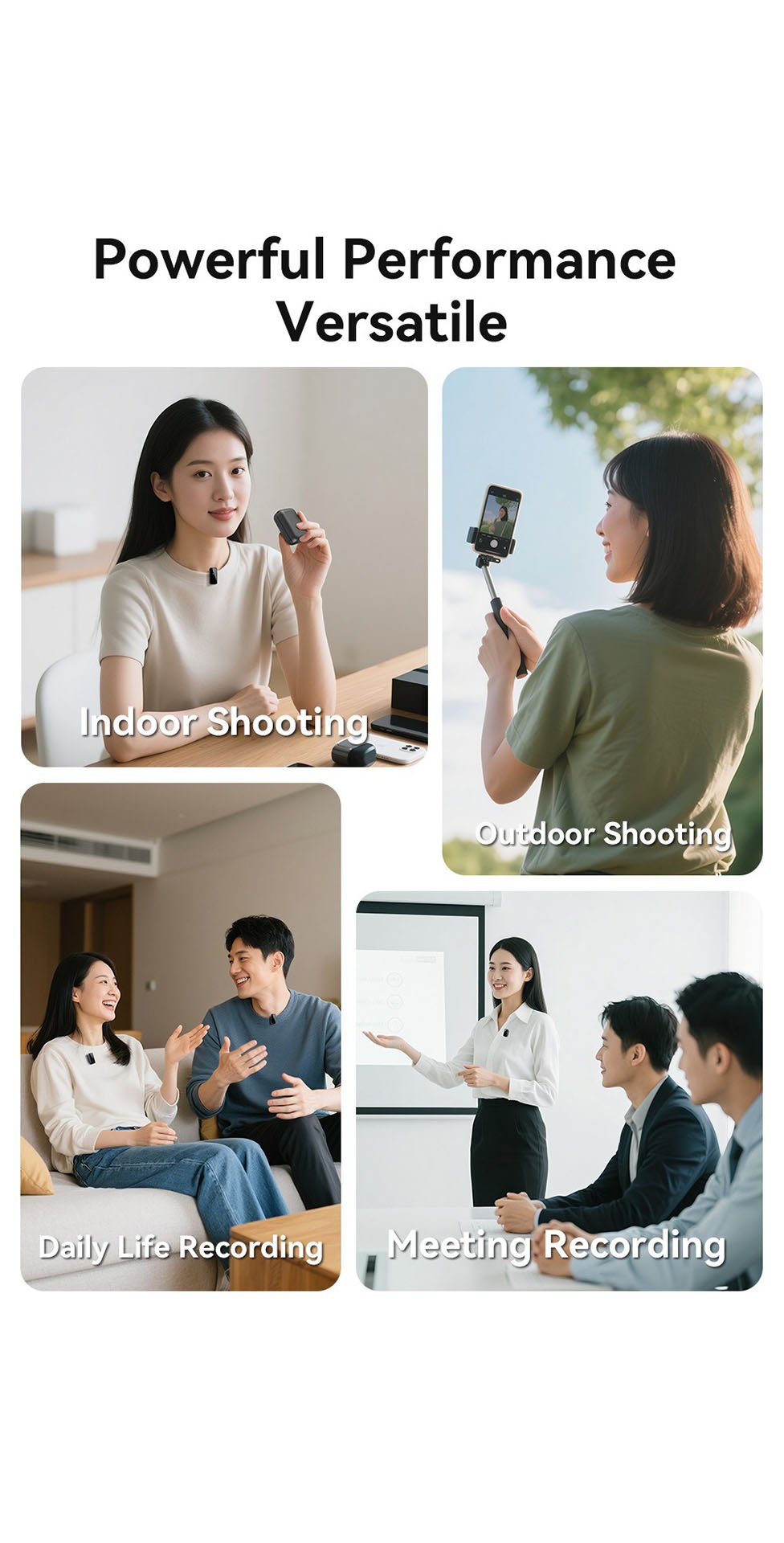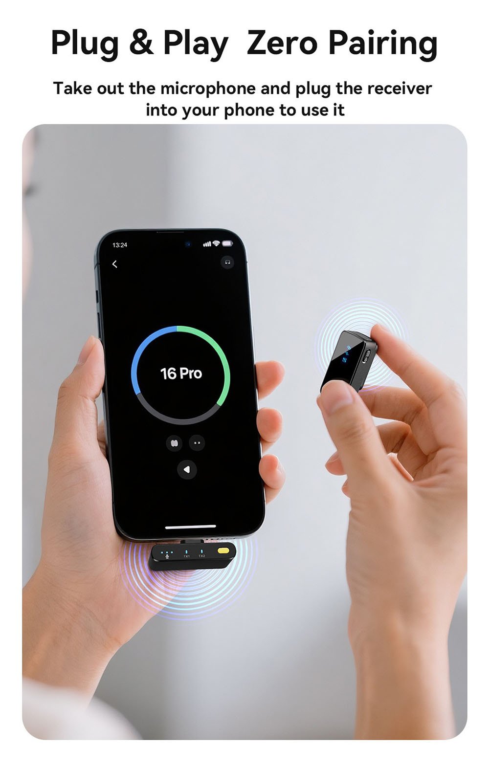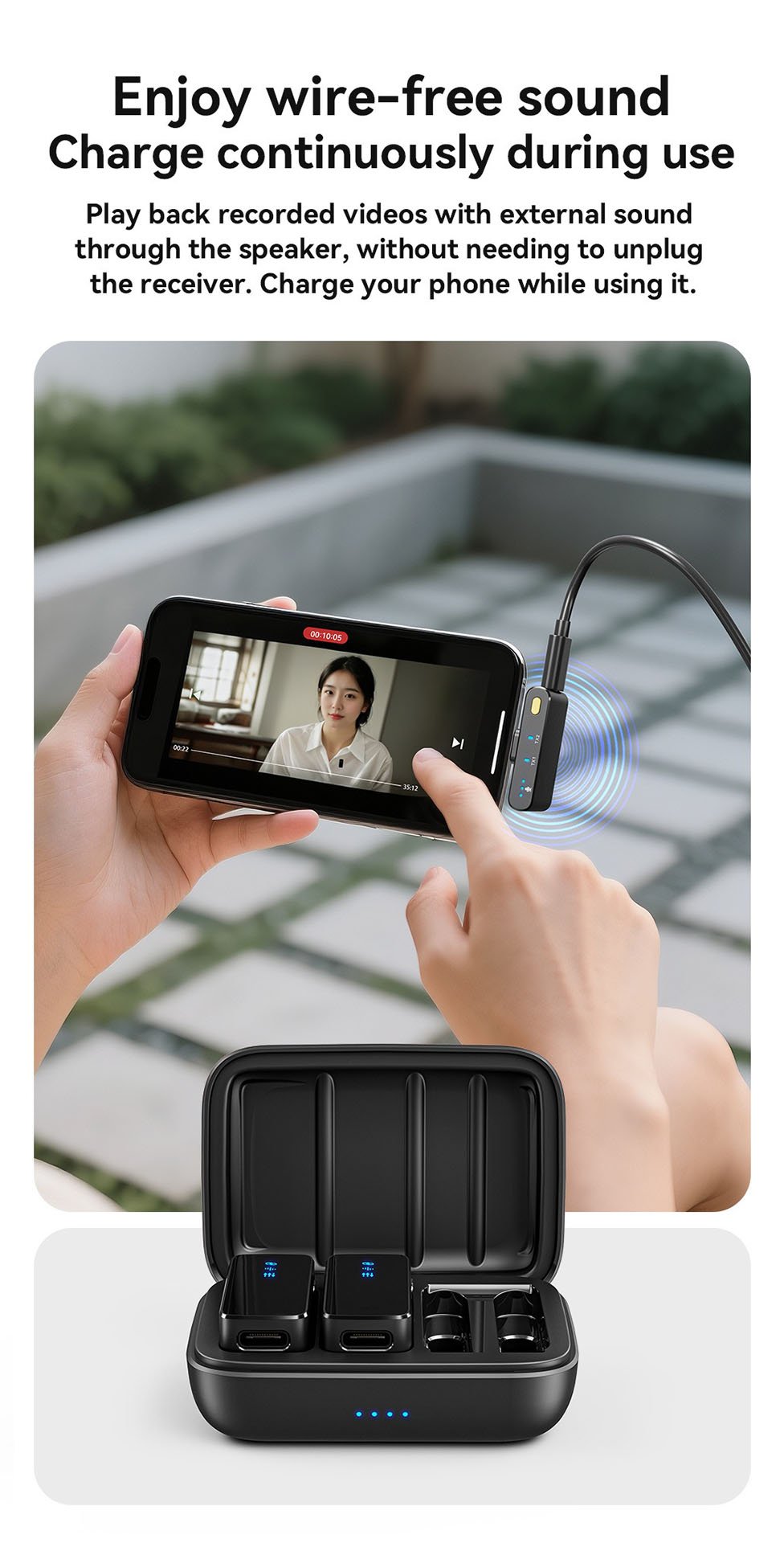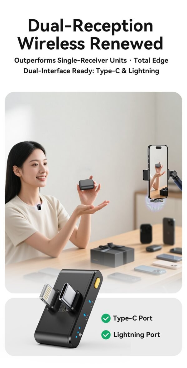 The secure clip design keeps the microphone firmly in place during filming, walking, or light movement, reducing the risk of accidental drops. With a two-in-one receiver and plug-and-play functionality, it supports both Lightning and Android devices without any complicated setup. Low-latency wireless transmission ensures precise audio-video synchronization, making it an ideal choice for live streaming and short-form video production. Available in multiple colors, this wireless lavalier lapel microphone is especially popular among young creators and female users.