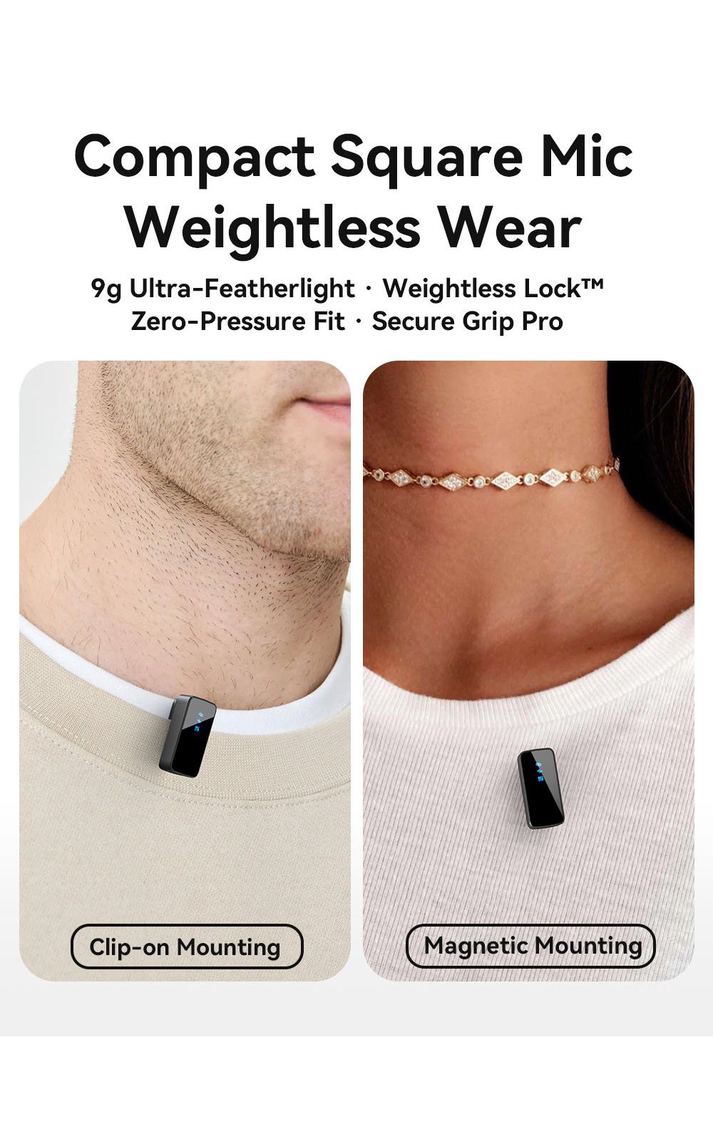 The wireless lavalier lapel microphone M73U is designed for creators who want professional audio performance in a compact and stylish form. With a size no larger than a finger, it is extremely lightweight and comfortable to wear, even during long recording sessions, without causing any discomfort. Its portable size, similar to a single earbud, makes it easy to slip into a pocket or bag, making it perfect for travel, outdoor filming, and everyday content creation.