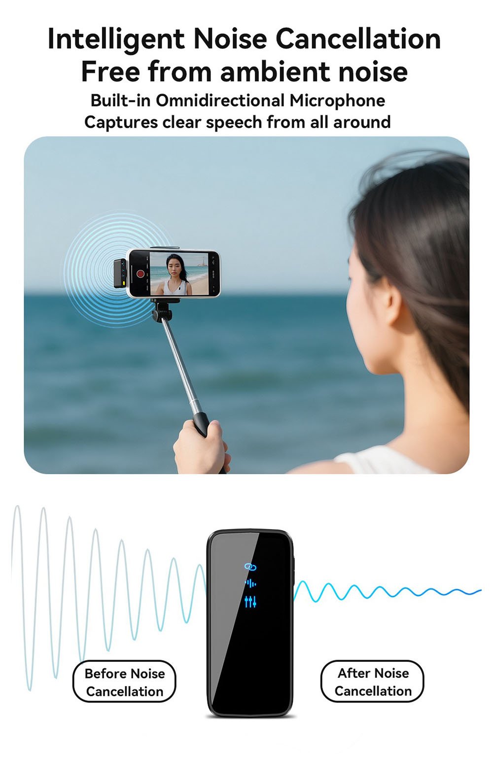 2:Portable size for travel and outdoor shooting: Similar in size to a single earbud, easy to carry in pockets or bags, perfect for travel and daily content creation.